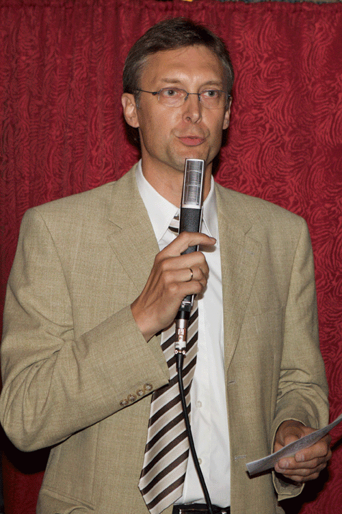 Geschäftsführer Reiner Greulich kündigt den nächsten Programmpunkt im Kinosaal an